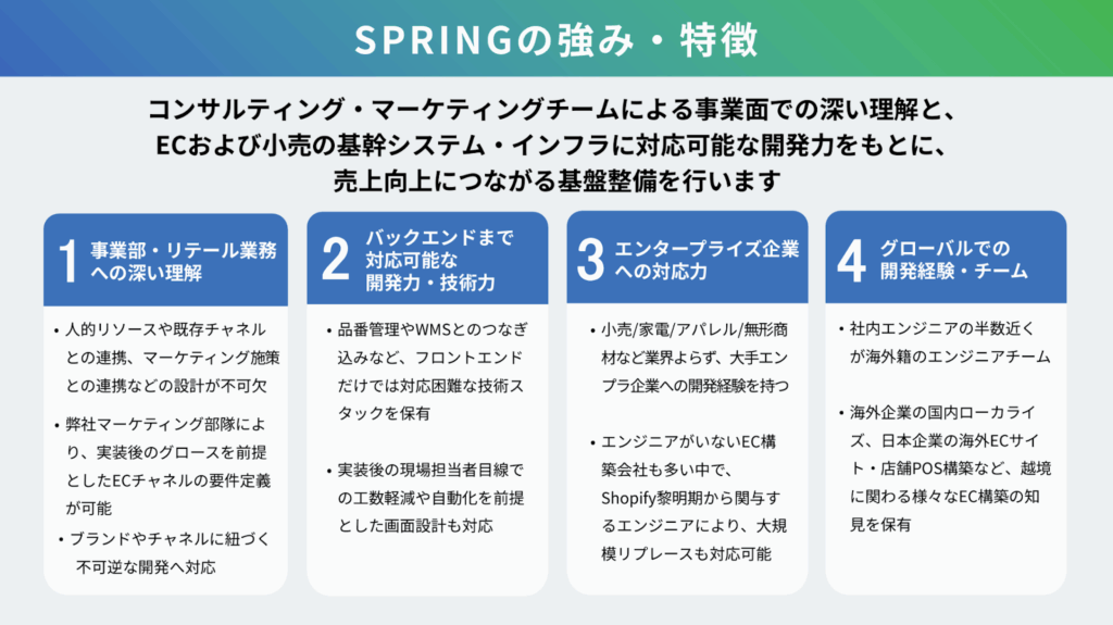 Tsuzucleは、EC事業者向けのシステム構築・データ移行・運用最適化を支援するテクノロジーカンパニーです。特にShopifyを基盤とした大規模EC構築、基幹システム連携、データ基盤設計に強みを持ち、数万SKU規模の案件からOMO戦略の推進まで幅広く支援しています。